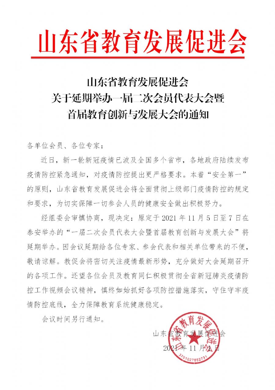 山东省教育发展促进会关于延期举办一届二次会员代表大会暨首届教育创新与发展大会的通知