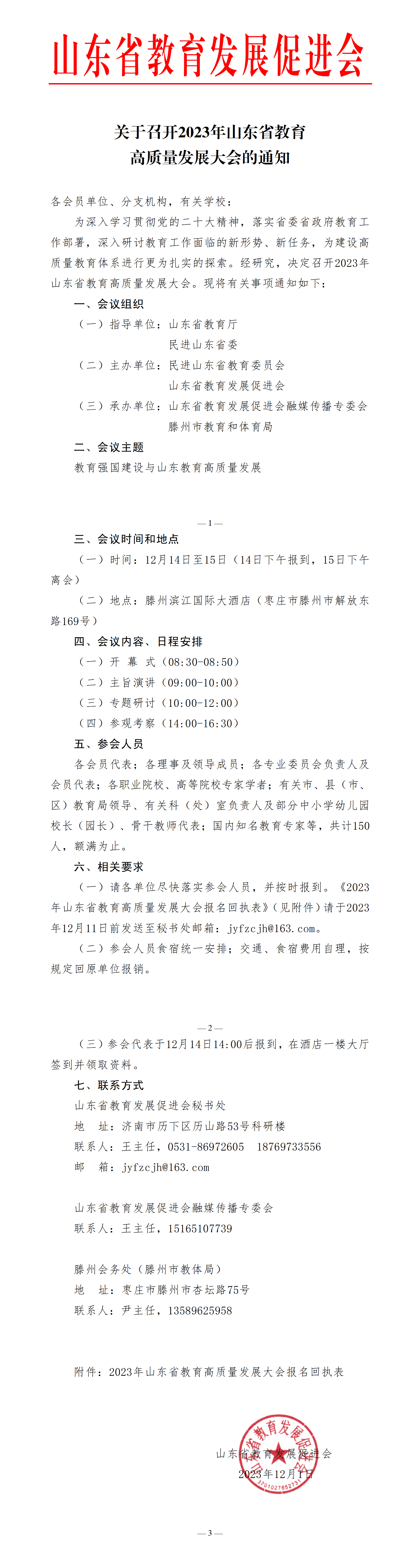 附件:2023年山东省教育高质量发展大会报名回执表